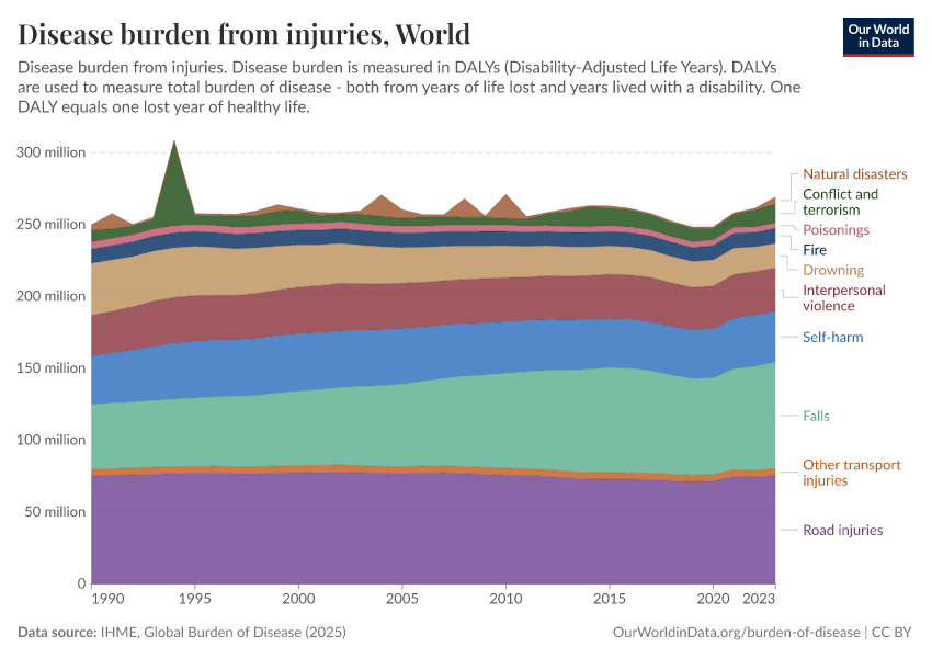 “Injuries” is a broad category that encompasses accidents (unintentional injuries such as falls, fire, and drowning, as well as transport injuries), as well as natural disasters, and violence including interpersonal violence, conflict, terrorism, and self-harm.