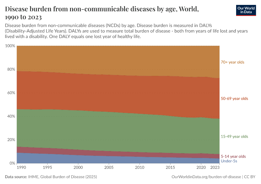 The chart also shows a notable shift since 1990, when communicable diseases held the highest share of the disease burden.