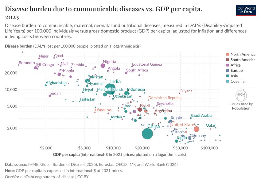 The burden of disease due to communicable diseases vs GDP per capita is shown in the following charts.