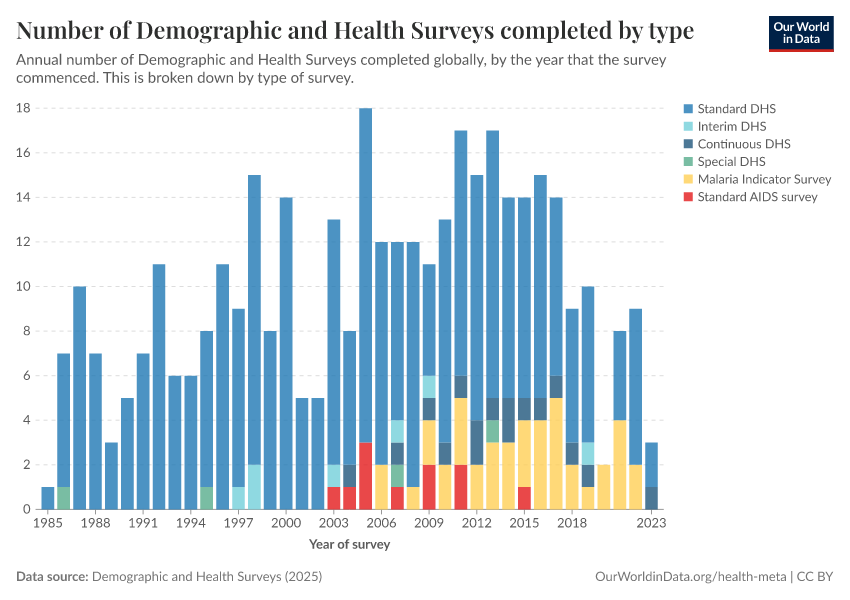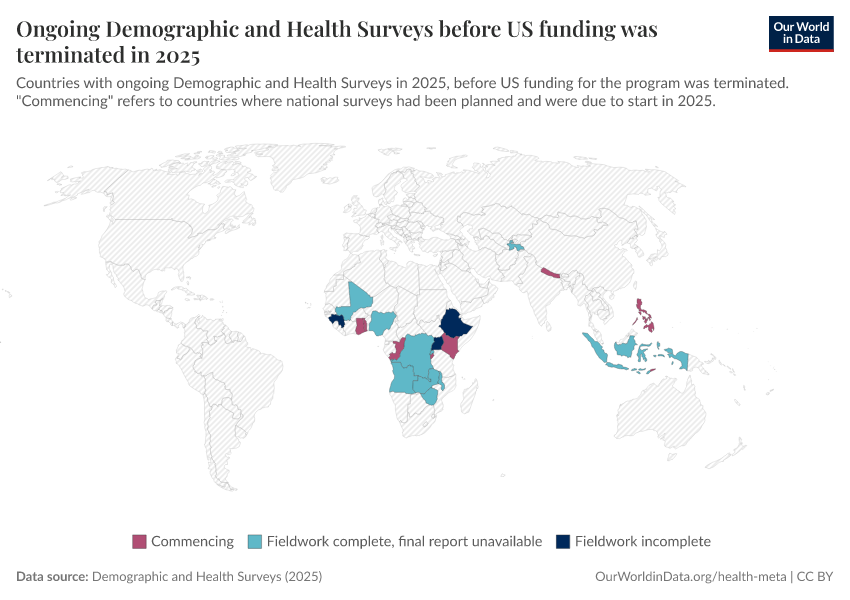 Saloni Dattani (2025) - “The Demographic and Health Surveys brought crucial data for more than 90 countries — without them, we risk darkness” Published online at OurWorldinData.org. Retrieved from: 'https://sophia-test-2.owid.pages.dev/demographic-health-surveys-risk' [Online Resource]BibTeX citation