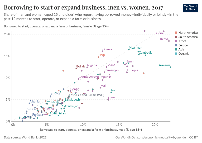 Above we show that there are large gender gaps in land ownership across low-income countries. Here we show that there are also large gaps in terms of access to borrowed capital.