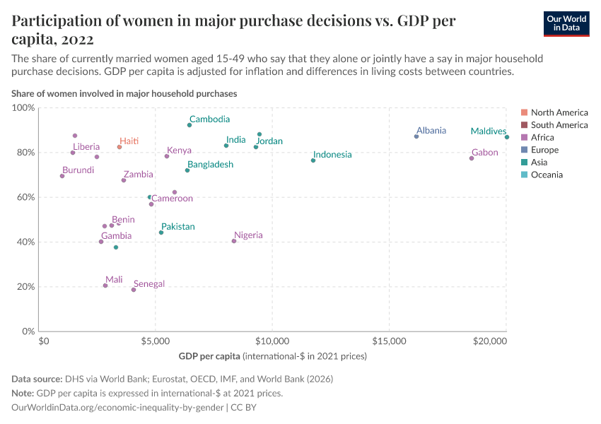 In this chart, we plot the share of currently married women who report having a say in major household purchase decisions, against national GDP per capita.
