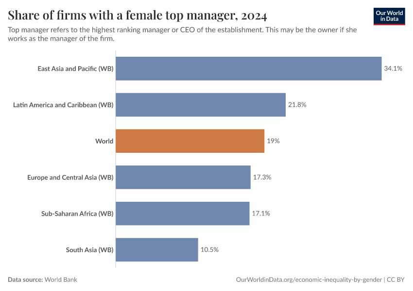 The next chart provides an alternative perspective on the same issue. Here we show the share of firms that have a woman as manager. We highlight world regions by default, but you can remove them and add specific countries.