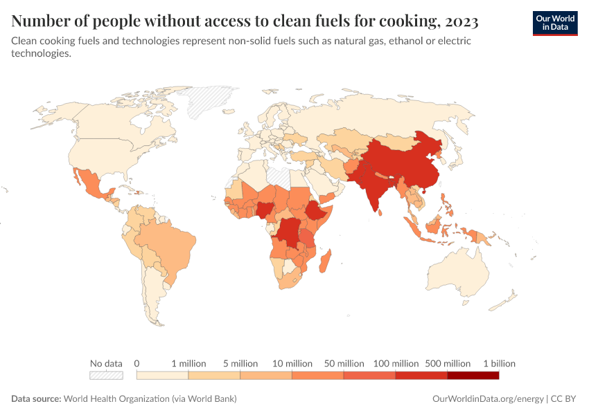 In the visualizations here, we see the number of people globally with and without clean cooking fuels and a world map of the number without access.