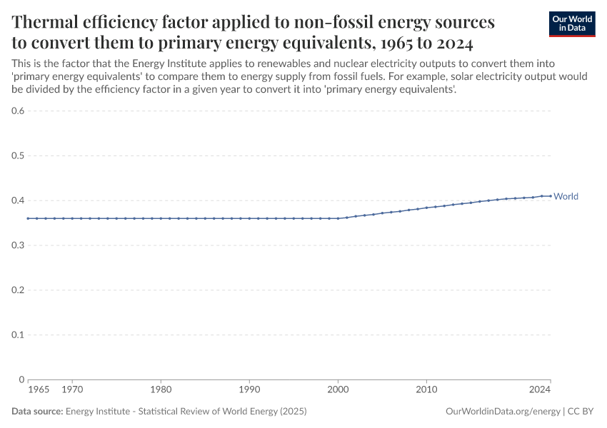 This adjustment is fairly crude. Non-fossil electricity generation is divided by a ‘thermal efficiency factor’, which is the average efficiency of fossil electricity. In the chart, we see the factor that the Energy Institute applies. This factor has changed over time due to changes in the composition of the fossil fuel mix (the split between coal and gas), and efficiency improvements in power plants over time.