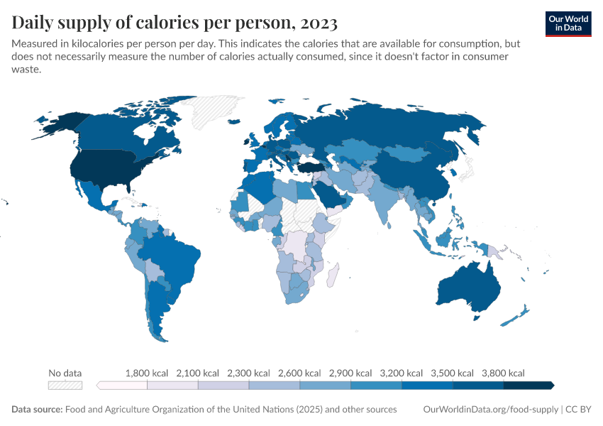 Max Roser, Hannah Ritchie, and Pablo Rosado (2013) - “Food Supply” Published online at OurWorldinData.org. Retrieved from: 'https://sophia-test-2.owid.pages.dev/food-supply' [Online Resource]BibTeX citation