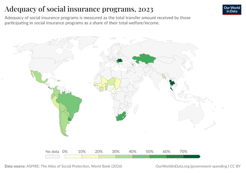 “Data Page: Adequacy of social insurance programs”. Our World in Data (2026). Data adapted from ASPIRE: The Atlas of Social Protection, World Bank. Retrieved from https://sophia-test-2.owid.pages.dev/grapher/adequacy-of-social-insurance-programs [online resource]How to cite this data