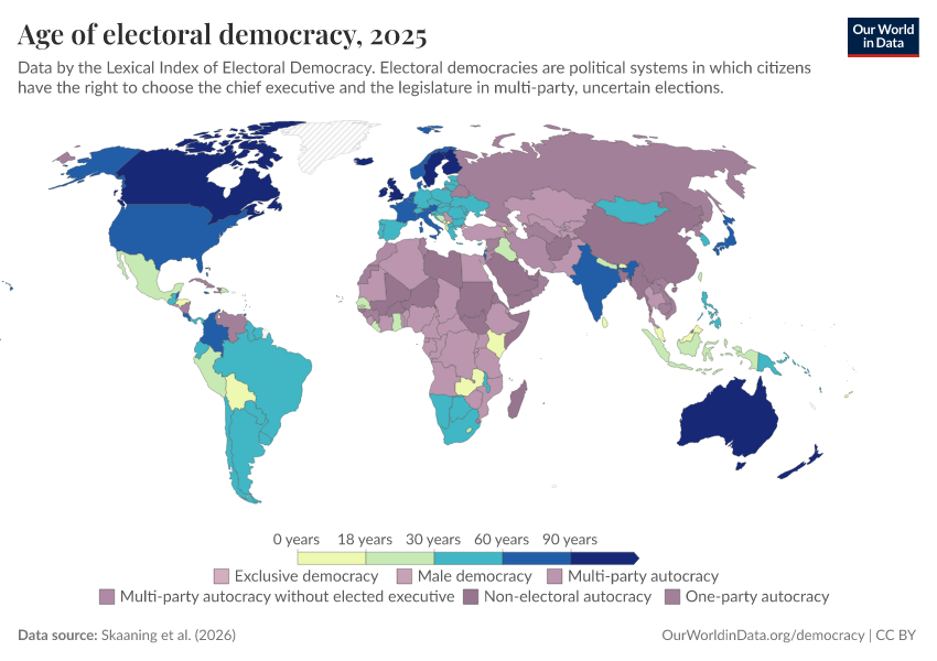 Skaaning et al. (2025) – processed by Our World in Data. “Age of electoral democracy” [dataset]. Skaaning et al., “Lexical Index of Electoral Democracy (LIED) v6.8” [original data]. Retrieved January 6, 2026 from https://sophia-test-2.owid.pages.dev/grapher/age-of-electoral-democracy-lexical