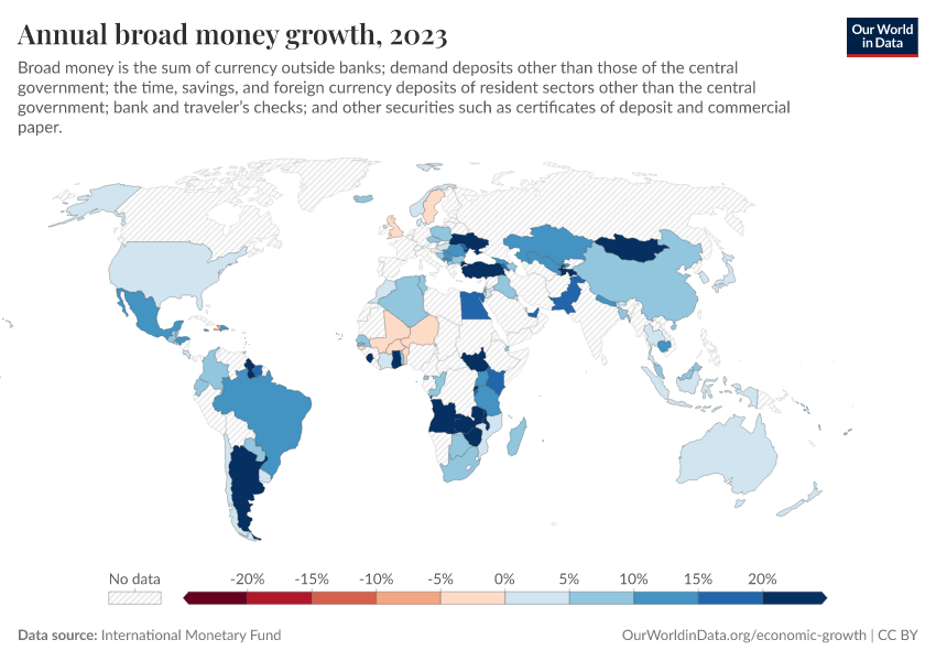 International Monetary Fund – processed by Our World in Data. “Annual broad money growth” [dataset]. International Monetary Fund, “International Monetary Fund, International Financial Statistics and data files.” [original data]. Retrieved January 6, 2026 from https://sophia-test-2.owid.pages.dev/grapher/annual-broad-money-growth