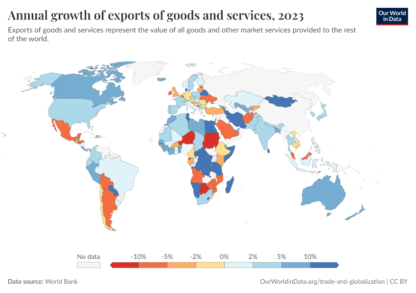 “Data Page: Annual growth of exports of goods and services”. Our World in Data (2026). Data adapted from World Bank. Retrieved from https://sophia-test-2.owid.pages.dev/grapher/annual-growth-of-exports-of-goods-and-services [online resource]How to cite this data