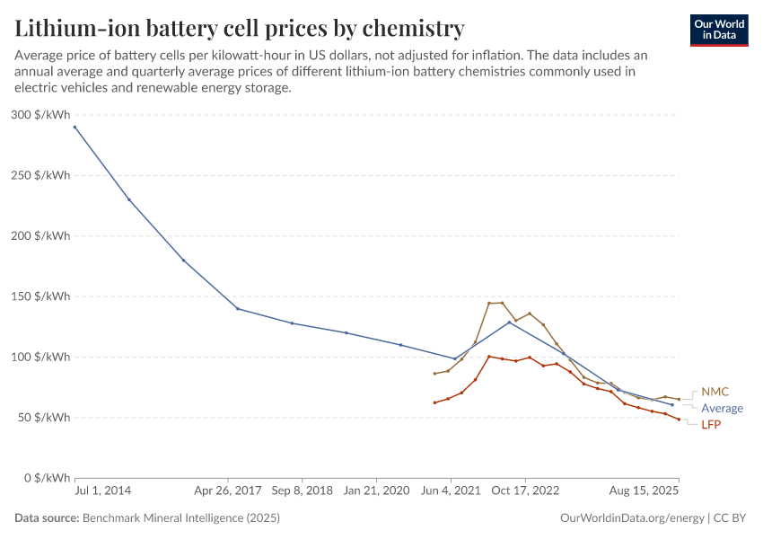 Benchmark Mineral Intelligence (2025) – with minor processing by Our World in Data. “Lithium-ion battery cell price” [dataset]. Benchmark Mineral Intelligence, “Lithium-ion battery prices”; Benchmark Mineral Intelligence, “Battery prices by chemistry” [original data]. Retrieved January 6, 2026 from https://sophia-test-2.owid.pages.dev/grapher/average-battery-cell-price