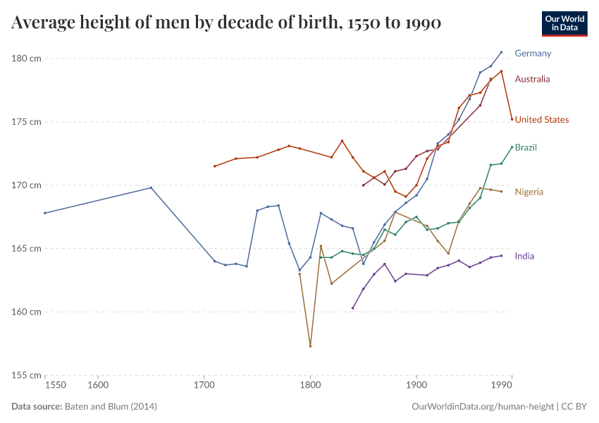 Baten and Blum (2014) – with minor processing by Our World in Data. “Average height of men by decade of birth” [dataset]. Baten and Blum, “Height” [original data]. Retrieved January 6, 2026 from https://sophia-test-2.owid.pages.dev/grapher/average-height-of-men-for-selected-countries