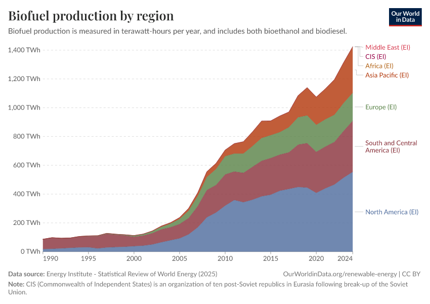 Energy Institute - Statistical Review of World Energy (2025) – with major processing by Our World in Data. “Biofuels production” [dataset]. Energy Institute, “Statistical Review of World Energy” [original data]. Retrieved January 6, 2026 from https://sophia-test-2.owid.pages.dev/grapher/biofuels-production-by-region