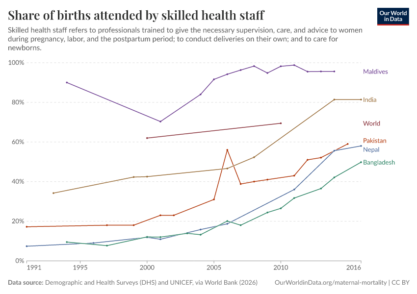 “Data Page: Share of births attended by skilled health staff”. Our World in Data (2026). Data adapted from Demographic and Health Surveys (DHS) and UNICEF, via World Bank. Retrieved from https://sophia-test-2.owid.pages.dev/grapher/births-attended-by-health-staff-sdgs [online resource]How to cite this data