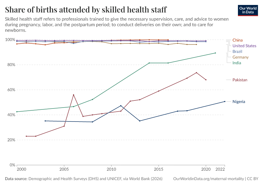 “Data Page: Share of births attended by skilled health staff”. Our World in Data (2026). Data adapted from Demographic and Health Surveys (DHS) and UNICEF, via World Bank. Retrieved from https://sophia-test-2.owid.pages.dev/grapher/births-attended-by-health-staff-sdgs [online resource]