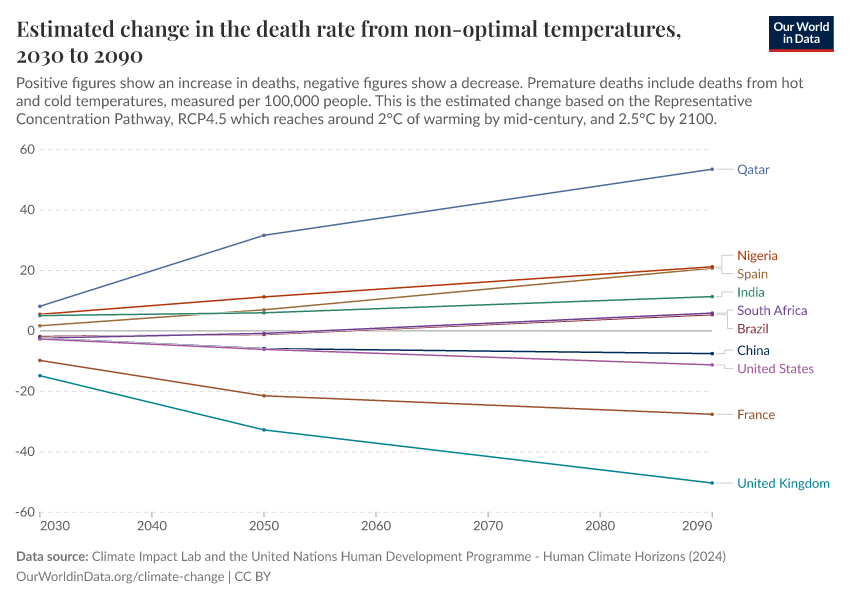 “Data Page: Estimated change in the death rate from non-optimal temperatures”. Our World in Data (2026). Data adapted from Climate Impact Lab and the United Nations Human Development Programme. Retrieved from https://sophia-test-2.owid.pages.dev/grapher/change-heat-death-rate [online resource]How to cite this data