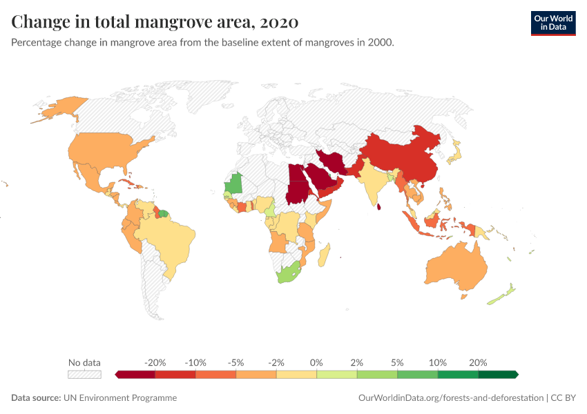 “Data Page: Change in total mangrove area”. Our World in Data (2026). Data adapted from UN Environment Programme. Retrieved from https://sophia-test-2.owid.pages.dev/grapher/change-in-total-mangrove-area [online resource]How to cite this data