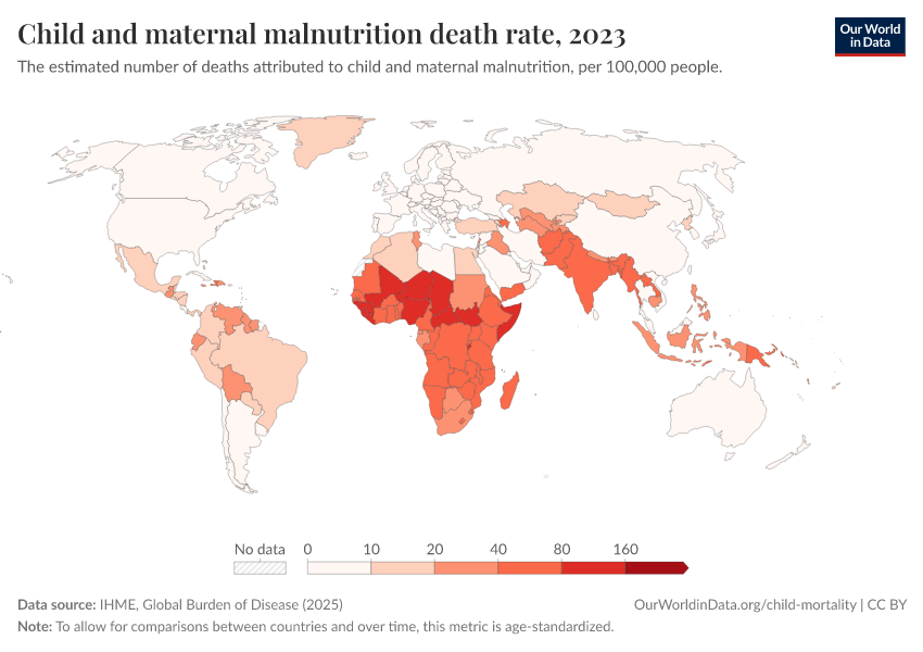 IHME, Global Burden of Disease (2024) – with minor processing by Our World in Data. “Child and maternal malnutrition death rate” [dataset]. IHME, Global Burden of Disease, “Global Burden of Disease - Risk Factors” [original data]. Retrieved January 6, 2026 from https://sophia-test-2.owid.pages.dev/grapher/child-and-maternal-malnutrition-death-rate