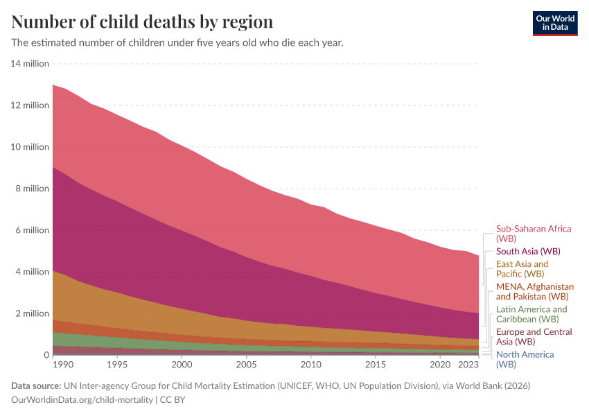 UN Inter-agency Group for Child Mortality Estimation (UNICEF, WHO, UN Population Division), via World Bank (2025) – processed by Our World in Data. “Number of child deaths by region” [dataset]. UN Inter-agency Group for Child Mortality Estimation (UNICEF, WHO, UN Population Division), via World Bank, “World Development Indicators 122” [original data]. Retrieved January 6, 2026 from https://sophia-test-2.owid.pages.dev/grapher/child-deaths-igme-data