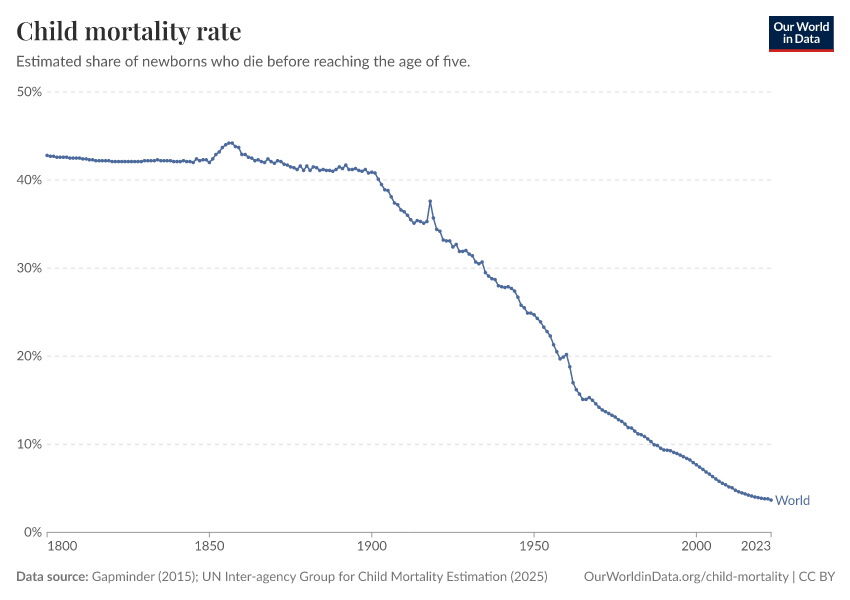 Gapminder (2015); UN Inter-agency Group for Child Mortality Estimation (2025) – processed by Our World in Data. “Child mortality rate – Gapminder; UN IGME – Long-run data” [dataset]. United Nations Inter-agency Group for Child Mortality Estimation, “United Nations Inter-agency Group for Child Mortality Estimation”; Gapminder, “Child mortality rate under age five v7”; Gapminder based on UN IGME & UN WPP, “Under-five Mortality v11”; Various sources, “Population” [original data]. Retrieved January 6, 2026 from https://sophia-test-2.owid.pages.dev/grapher/child-mortality