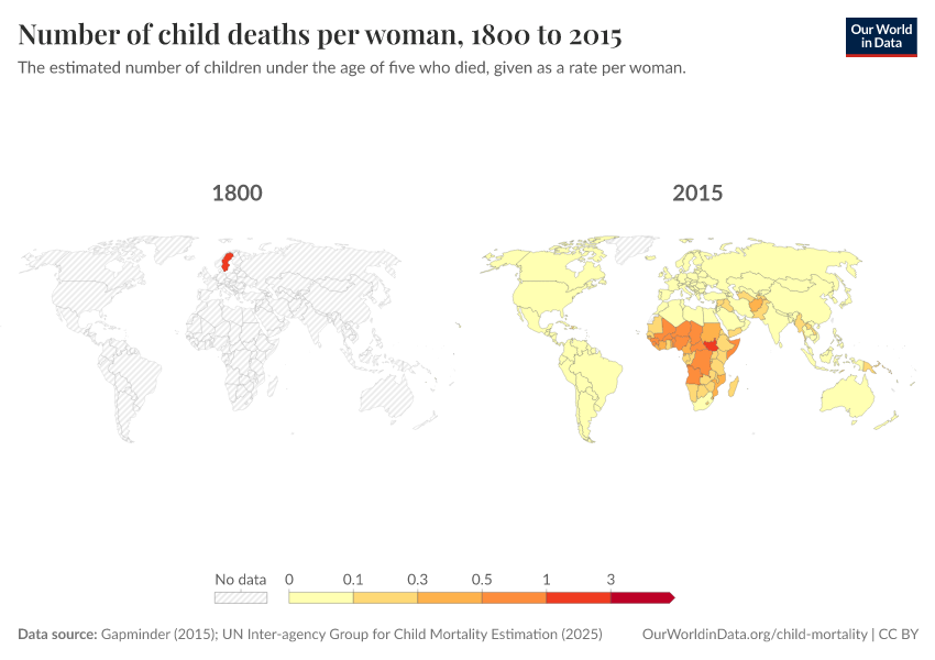 Gapminder (2015); UN Inter-agency Group for Child Mortality Estimation (2025) – processed by Our World in Data. “Child mortality rate – Gapminder; UN IGME – Long-run data” [dataset]. United Nations Inter-agency Group for Child Mortality Estimation, “United Nations Inter-agency Group for Child Mortality Estimation”; Gapminder, “Child mortality rate under age five v7”; Gapminder based on UN IGME & UN WPP, “Under-five Mortality v11”; United Nations, “World Population Prospects”; Gapminder, “Babies per woman (total fertility rate) v12”; Various sources, “Population” [original data]. Retrieved January 6, 2026 from https://sophia-test-2.owid.pages.dev/grapher/children-died-before-five-per-woman