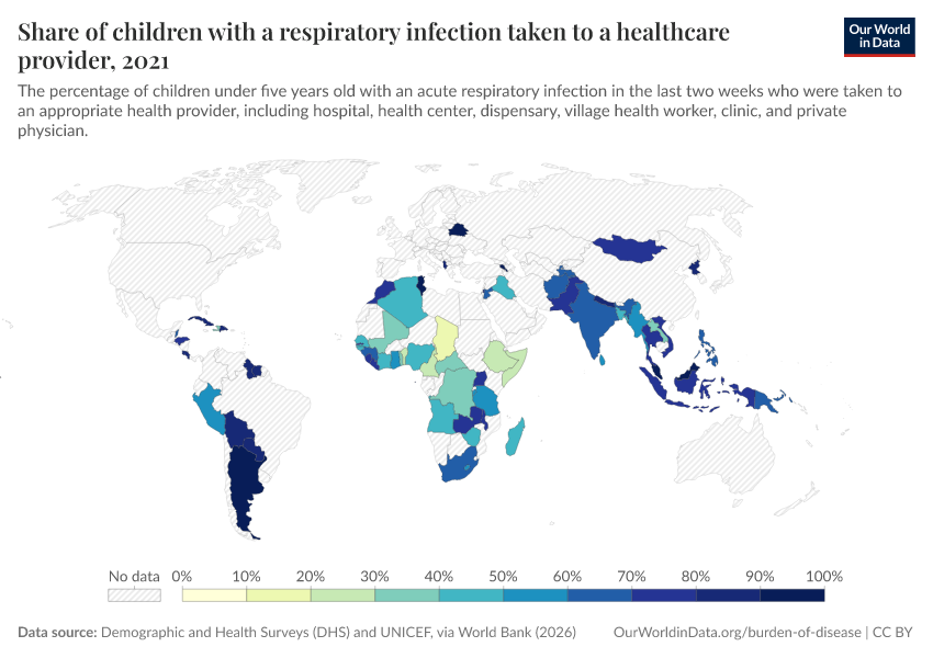 “Data Page: Share of children with a respiratory infection taken to a healthcare provider ”. Our World in Data (2026). Data adapted from Demographic and Health Surveys (DHS) and UNICEF, via World Bank. Retrieved from https://sophia-test-2.owid.pages.dev/grapher/children-treated-ari [online resource]How to cite this data