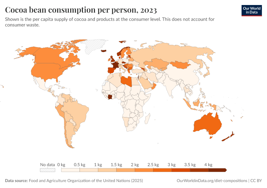 “Data Page: Yearly per capita supply of cocoa beans”. Our World in Data (2026). Data adapted from Food and Agriculture Organization of the United Nations. Retrieved from https://sophia-test-2.owid.pages.dev/grapher/chocolate-consumption-per-person [online resource]How to cite this data