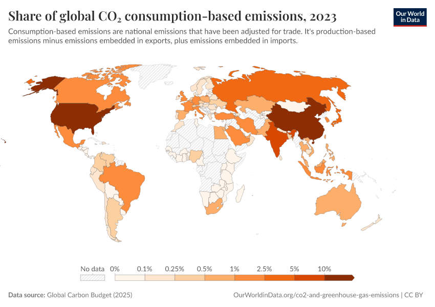 “Data Page: Share of global CO₂ consumption-based emissions”, part of the following publication: Hannah Ritchie, Pablo Rosado, and Max Roser (2023) - “CO₂ and Greenhouse Gas Emissions”. Data adapted from Global Carbon Project. Retrieved from https://sophia-test-2.owid.pages.dev/grapher/co2-consumption-share [online resource]How to cite this data