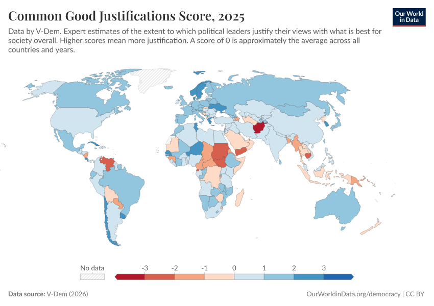 “Data Page: Common good justifications”, part of the following publication: Bastian Herre, Lucas Rodés-Guirao, and Esteban Ortiz-Ospina (2013) - “Democracy”. Data adapted from V-Dem. Retrieved from https://sophia-test-2.owid.pages.dev/grapher/common-good-justifications-score [online resource]How to cite this data