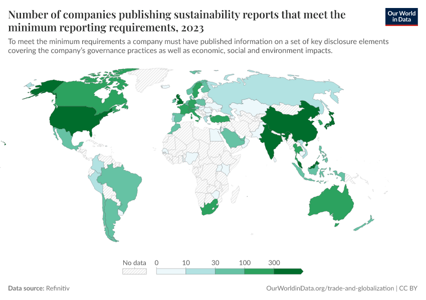 “Data Page: Number of companies publishing sustainability reports that meet the minimum reporting requirements”. Our World in Data (2026). Data adapted from Refinitiv. Retrieved from https://sophia-test-2.owid.pages.dev/grapher/companies-publishing-sustainability-reports-minimum-requirements [online resource]How to cite this data