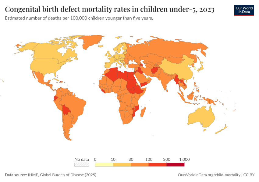 IHME, Global Burden of Disease (2024) – with minor processing by Our World in Data. “Congenital birth defect mortality rates in children under-5” [dataset]. IHME, Global Burden of Disease, “Global Burden of Disease - Deaths and DALYs” [original data]. Retrieved January 6, 2026 from https://sophia-test-2.owid.pages.dev/grapher/congenital-birth-defect-mortality-rates-in-children-under-5