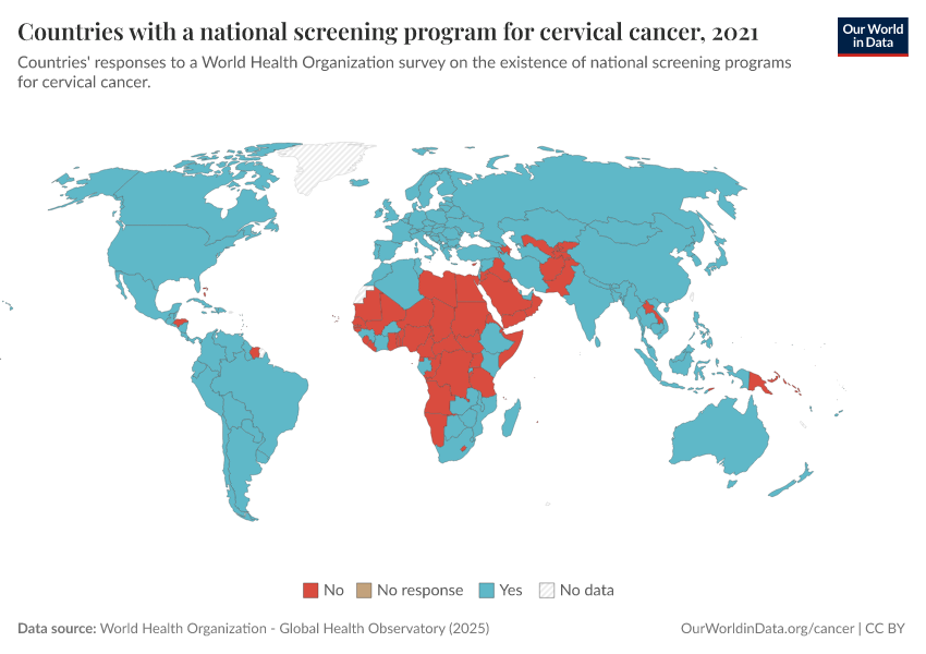 “Data Page: Countries with a national screening program for cervical cancer”. Our World in Data (2026). Data adapted from World Health Organization. Retrieved from https://sophia-test-2.owid.pages.dev/grapher/countries-with-national-cervical-cancer-screening-program [online resource]How to cite this data