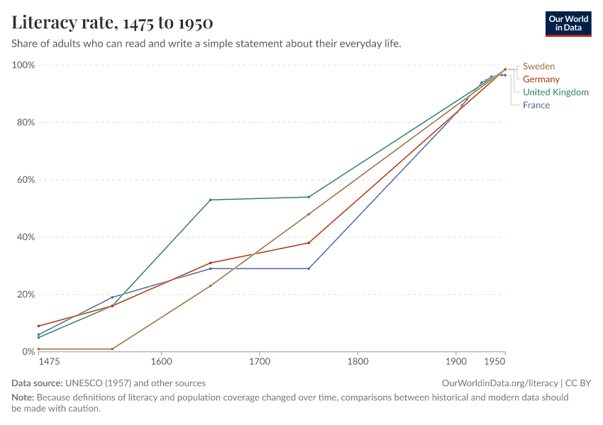 - 1451–1800: Direct literacy surveys did not exist during this period. Data for Great Britain, Ireland, France, Belgium, the Netherlands, Germany, Italy, Spain, Sweden, and Poland comes from the "Charting the Rise of the West" study. The authors estimated literacy rates using manuscript and book production as indirect indicators. While more books likely indicated more readers, this approach has clear limitations.