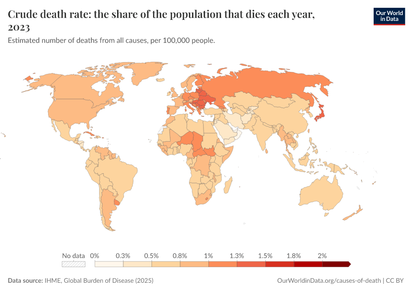IHME, Global Burden of Disease (2024) – with minor processing by Our World in Data. “Crude death rate: the share of the population that dies each year” [dataset]. IHME, Global Burden of Disease, “Global Burden of Disease - Deaths and DALYs” [original data]. Retrieved January 6, 2026 from https://sophia-test-2.owid.pages.dev/grapher/crude-death-rate-the-share-of-the-population-that-dies-each-year-gbd