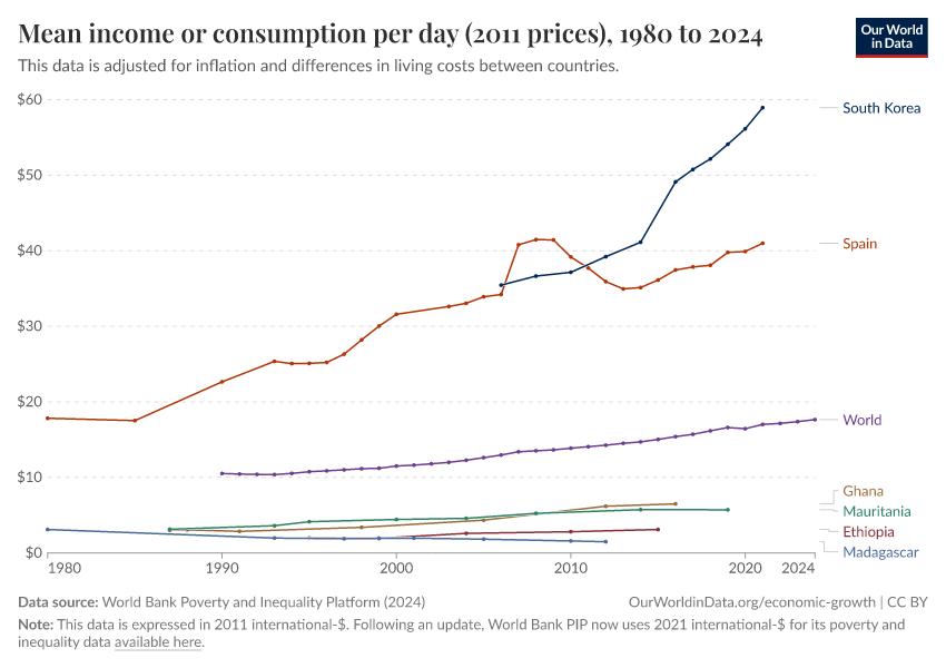 World Bank Poverty and Inequality Platform (2024) – with major processing by Our World in Data. “Mean income or consumption per day (2011 prices) – World Bank” [dataset]. World Bank Poverty and Inequality Platform, “World Bank Poverty and Inequality Platform (PIP) 20240627_2017, 20240627_2011” [original data]. Retrieved January 6, 2026 from https://sophia-test-2.owid.pages.dev/grapher/daily-mean-income-2011-ppp