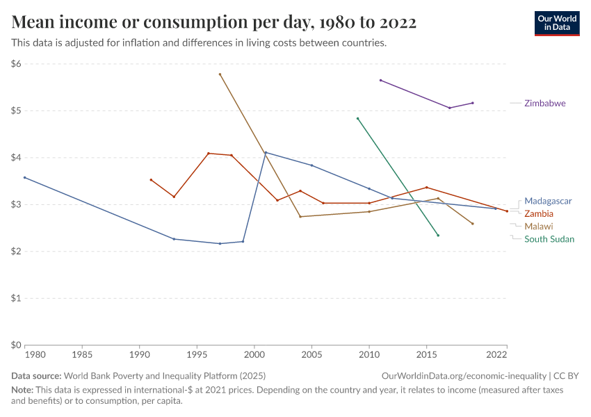 World Bank Poverty and Inequality Platform (2025) – with major processing by Our World in Data. “Mean income or consumption per day – World Bank” [dataset]. World Bank Poverty and Inequality Platform, “World Bank Poverty and Inequality Platform (PIP) 20250930_2021, 20250930_2017” [original data]. Retrieved January 6, 2026 from https://sophia-test-2.owid.pages.dev/grapher/daily-mean-income