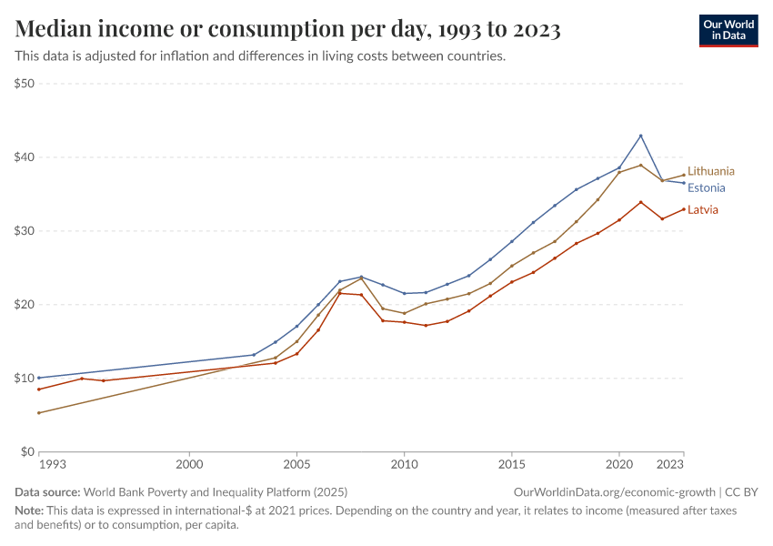 “Data Page: Median income or consumption per day”, part of the following publication: Joe Hasell, Bertha Rohenkohl, Pablo Arriagada, Esteban Ortiz-Ospina, and Max Roser (2022) - “Poverty”. Data adapted from World Bank Poverty and Inequality Platform. Retrieved from https://sophia-test-2.owid.pages.dev/grapher/daily-median-income [online resource]