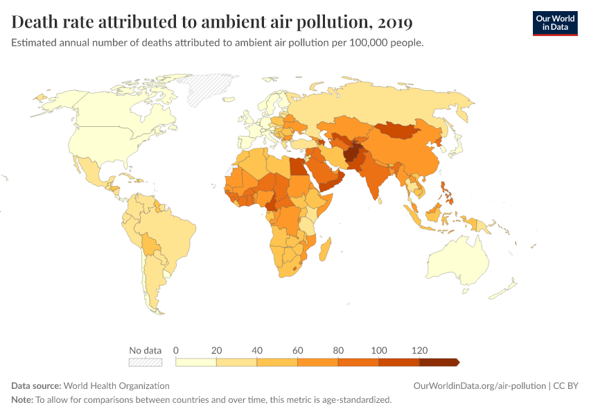 “Data Page: Death rate attributed to ambient air pollution”. Our World in Data (2026). Data adapted from World Health Organization. Retrieved from https://sophia-test-2.owid.pages.dev/grapher/death-rate-ambient-air-pollution [online resource]How to cite this data