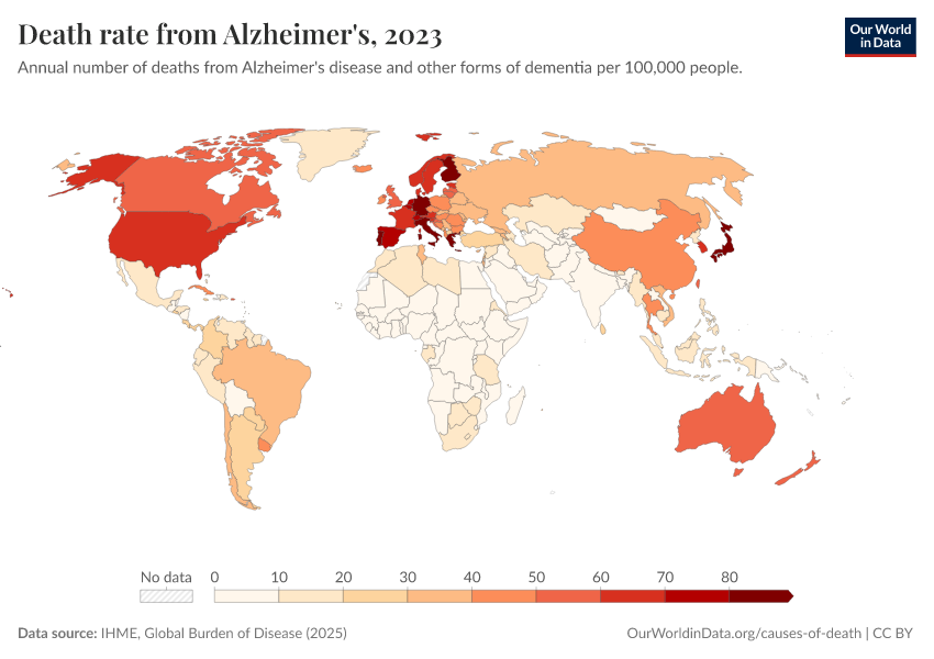 “Data Page: Death rate from Alzheimer's”, part of the following publication: Esteban Ortiz-Ospina and Max Roser (2016) - “Global Health”. Data adapted from IHME, Global Burden of Disease. Retrieved from https://sophia-test-2.owid.pages.dev/grapher/death-rate-from-alzheimers-other-dementias-gbd [online resource]How to cite this data