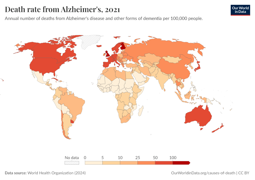 World Health Organization (2024) – with major processing by Our World in Data. “Death rate from Alzheimer's” [dataset]. World Health Organization, “Global Health Estimates” [original data]. Retrieved January 6, 2026 from https://sophia-test-2.owid.pages.dev/grapher/death-rate-from-alzheimers-other-dementias-ghe