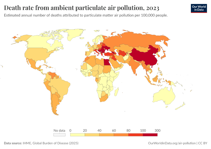 IHME, Global Burden of Disease (2024) – with minor processing by Our World in Data. “Death rate from ambient particulate air pollution” [dataset]. IHME, Global Burden of Disease, “Global Burden of Disease - Risk Factors” [original data]. Retrieved January 6, 2026 from https://sophia-test-2.owid.pages.dev/grapher/death-rate-from-ambient-particulate-air-pollution