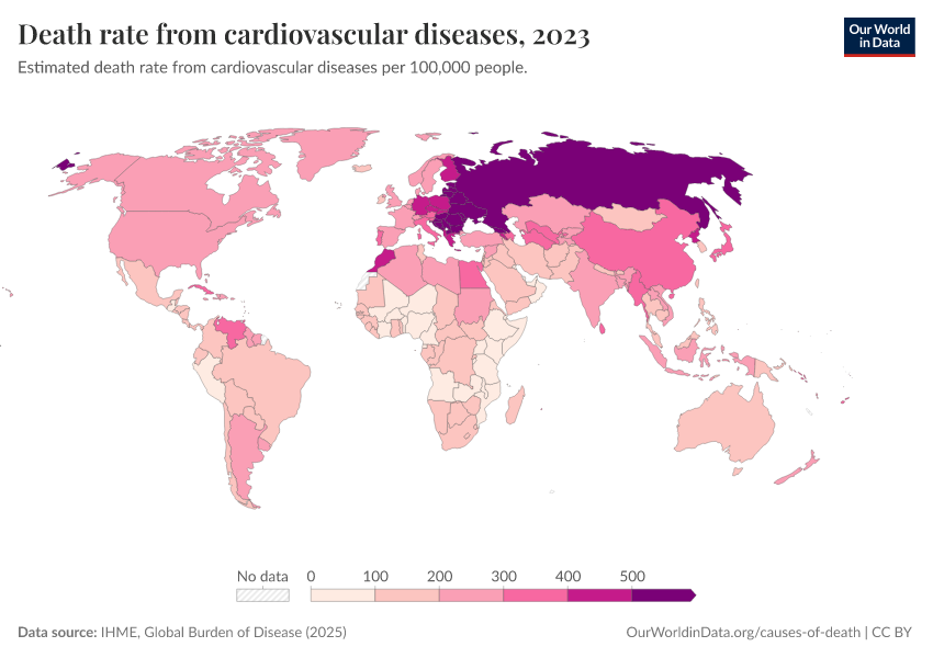 IHME, Global Burden of Disease (2024) – with minor processing by Our World in Data. “Death rate from cardiovascular diseases” [dataset]. IHME, Global Burden of Disease, “Global Burden of Disease - Deaths and DALYs” [original data]. Retrieved January 6, 2026 from https://sophia-test-2.owid.pages.dev/grapher/death-rate-from-cardiovascular-diseases