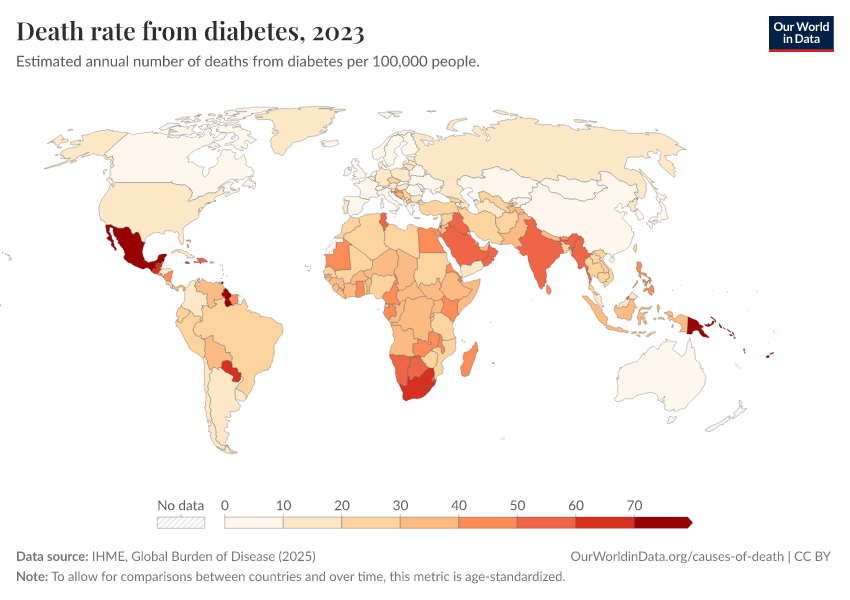 IHME, Global Burden of Disease (2024) – with minor processing by Our World in Data. “Death rate from diabetes” [dataset]. IHME, Global Burden of Disease, “Global Burden of Disease - Deaths and DALYs” [original data]. Retrieved January 6, 2026 from https://sophia-test-2.owid.pages.dev/grapher/death-rate-from-diabetes