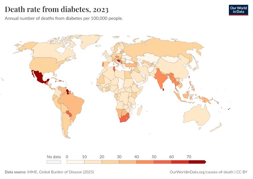 IHME, Global Burden of Disease (2024) – with minor processing by Our World in Data. “Death rate from diabetes” [dataset]. IHME, Global Burden of Disease, “Global Burden of Disease - Deaths and DALYs” [original data]. Retrieved January 6, 2026 from https://sophia-test-2.owid.pages.dev/grapher/death-rate-from-diabetes-gbd