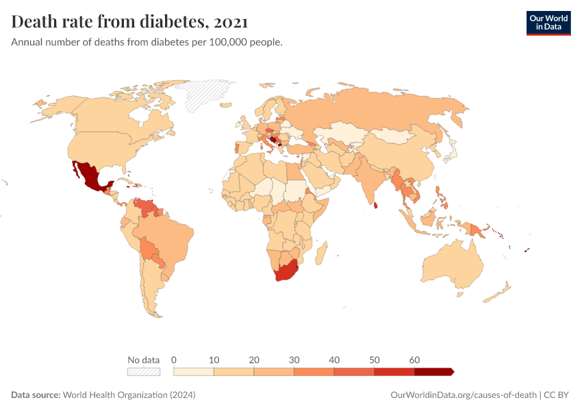 World Health Organization (2024) – with major processing by Our World in Data. “Death rate from diabetes” [dataset]. World Health Organization, “Global Health Estimates” [original data]. Retrieved January 6, 2026 from https://sophia-test-2.owid.pages.dev/grapher/death-rate-from-diabetes-ghe