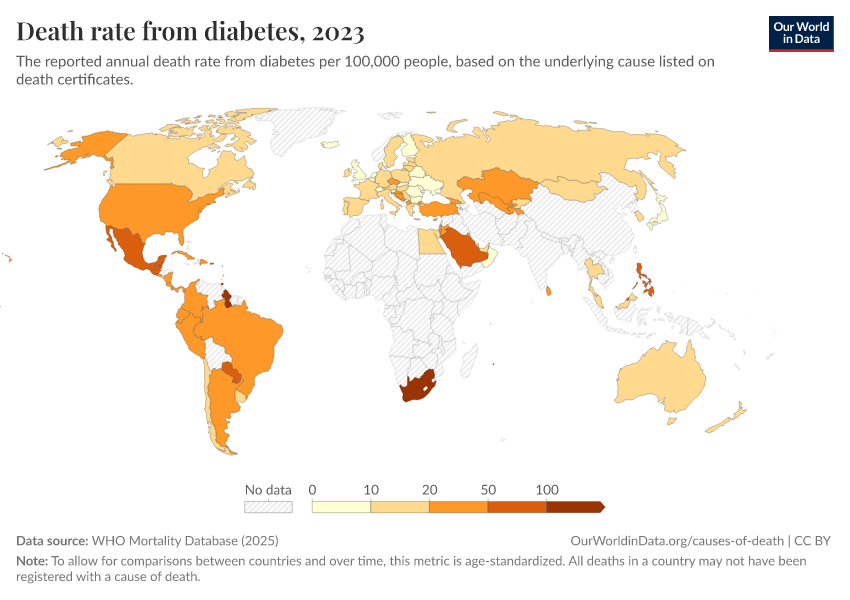 WHO Mortality Database (2025) – with minor processing by Our World in Data. “Death rate from diabetes” [dataset]. WHO Mortality Database, “WHO Mortality Database” [original data]. Retrieved January 6, 2026 from https://sophia-test-2.owid.pages.dev/grapher/death-rate-from-diabetes-who-mdb
