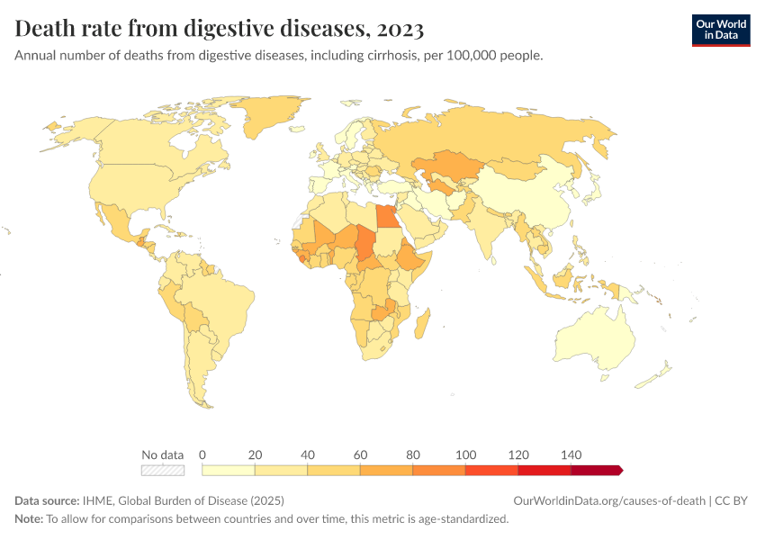 IHME, Global Burden of Disease (2024) – with minor processing by Our World in Data. “Death rate from digestive diseases” [dataset]. IHME, Global Burden of Disease, “Global Burden of Disease - Deaths and DALYs” [original data]. Retrieved January 6, 2026 from https://sophia-test-2.owid.pages.dev/grapher/death-rate-from-digestive-diseases