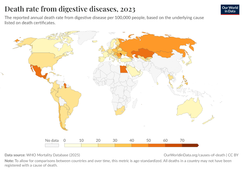 WHO Mortality Database (2025) – with minor processing by Our World in Data. “Death rate from digestive diseases” [dataset]. WHO Mortality Database, “WHO Mortality Database” [original data]. Retrieved January 6, 2026 from https://sophia-test-2.owid.pages.dev/grapher/death-rate-from-digestive-diseases-who-mdb