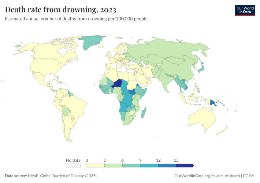 IHME, Global Burden of Disease (2024) – with minor processing by Our World in Data. “Death rate from drowning” [dataset]. IHME, Global Burden of Disease, “Global Burden of Disease - Deaths and DALYs” [original data]. Retrieved January 6, 2026 from https://sophia-test-2.owid.pages.dev/grapher/death-rate-from-drowning