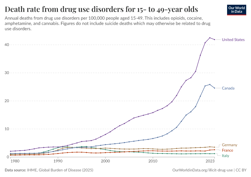 IHME, Global Burden of Disease (2024) – with minor processing by Our World in Data. “Death rate from drug use disorders for 15- to 49-year olds” [dataset]. IHME, Global Burden of Disease, “Global Burden of Disease - Deaths and DALYs” [original data]. Retrieved January 6, 2026 from https://sophia-test-2.owid.pages.dev/grapher/death-rate-from-drug-use-disorders-for-15--to-49-year-olds